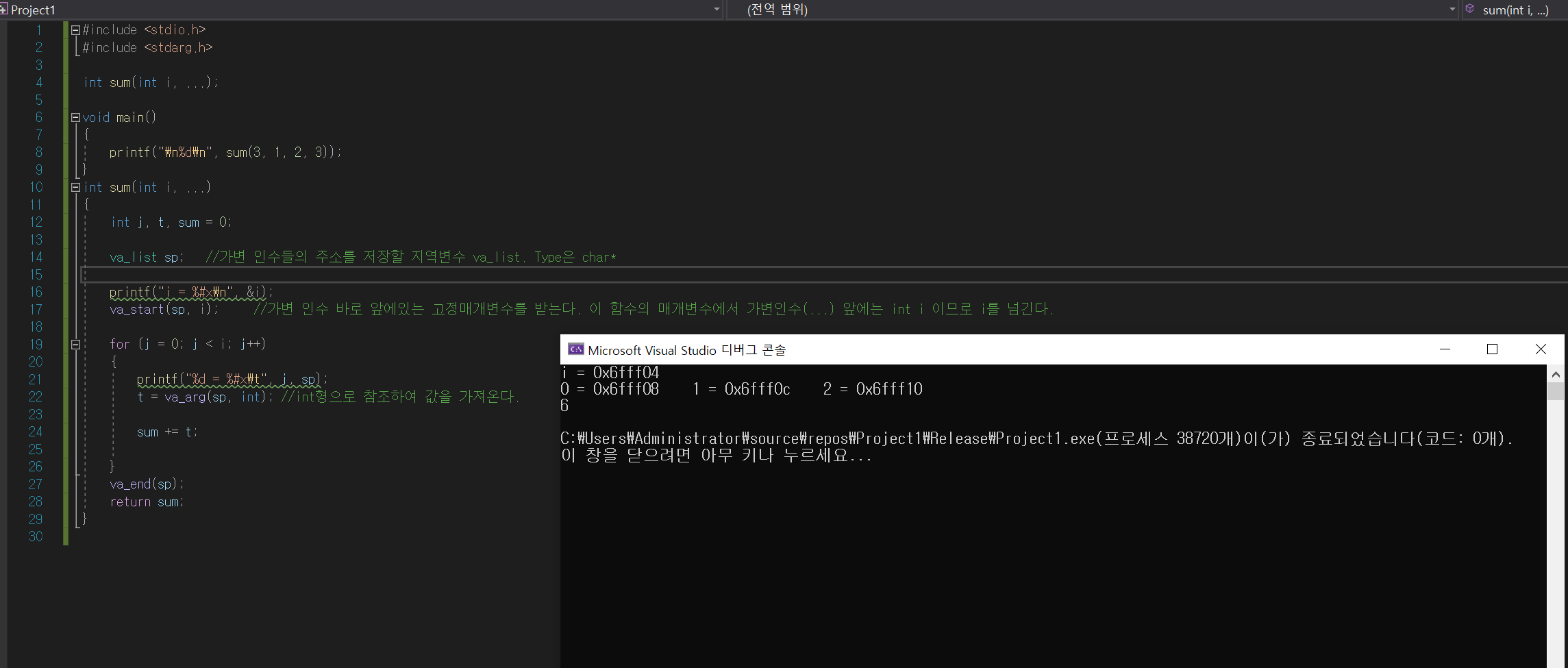 va_start(sp, i); //가변 인수 바로 앞에있는 고정매개변수를 받는다. 이 함수의 매개변수에서 가변인수(...) 앞에는 int i 이므로 i를 넘긴다.