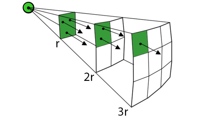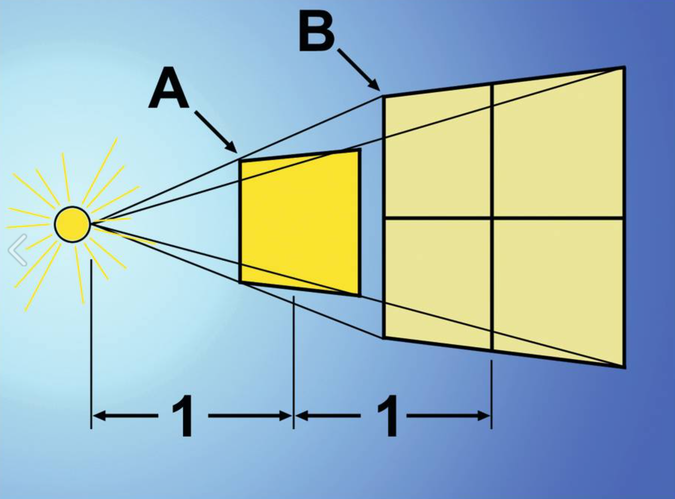 빛은 피사체에 가까워질수록 빛의 세기는 강해집니다. 조명과 피사체의 거리를 2배로 벌리면 밝기가 1/4로 줄어들고, 반대로 2배로 좁히면 4배로 밝아집니다. 이유는 아래와 같이 면적이 달라지기 때문입니다.