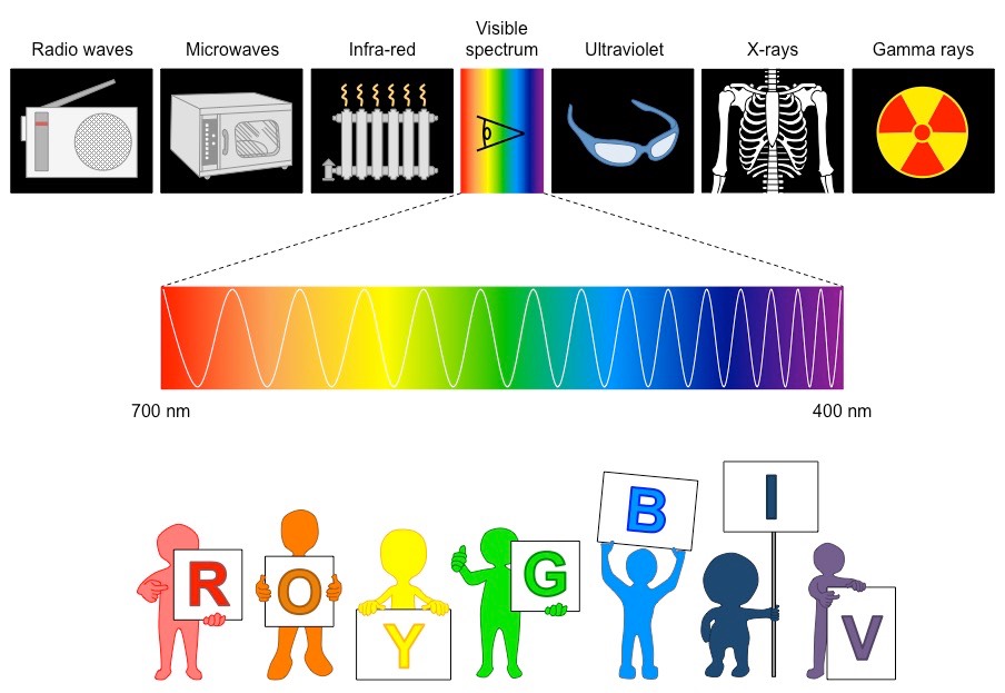 4. 가시광선 : 뜻풀이 그대로 사람이 눈으로 인식 할 수 있는 영역의 파장입니다. 파장에 따라 사람 눈에는 색으로 보이며, 그 예시로 위에 빨,주,노,초,파,남,보로 되어 있습니다.