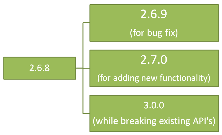2. 버전 번호는 반드시 X.Y.Z의 형태로 하고, X, Y, Z는 각각 자연수(음이 아닌 정수)이고, 절대로 0이 앞에 붙어서는 안 된다. X는 Major 버전 번호이고, Y는 Minor 버전 번호이며, Z는 Patches 버전 번호이다. 각각은 반드시 증가하는 수여야 한다. 예: 1.9.0 -> 1.10.0 -> 1.11.0.