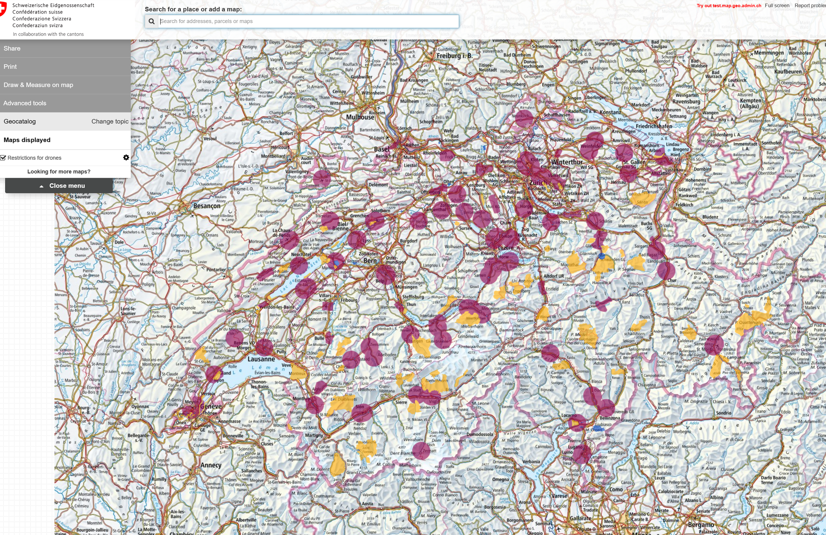 스위스의 드론 제한구역을 확인하려면 FOCA(Federal Office of Civil Aviation) 사이트에 접속하여 드론쪽을 살펴보면 됩니다. 아래 링크를 참고하세요.