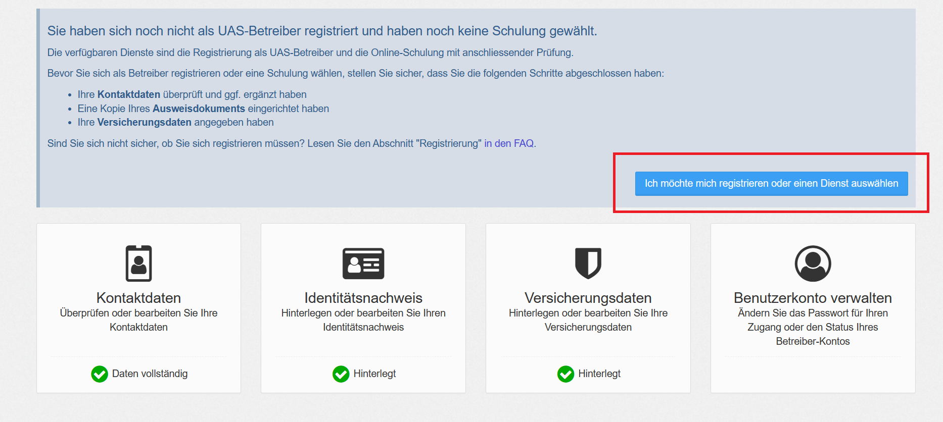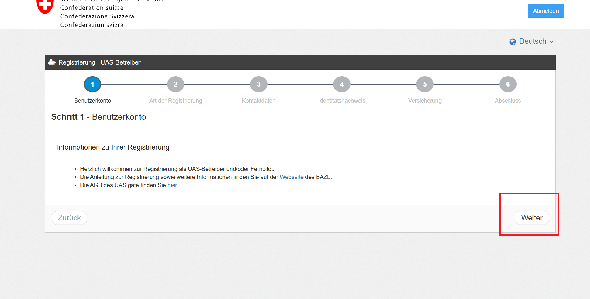 (4) 가입 하면 UAS 등록 창이 뜹니다. 오른쪽 아래 Weiter를 클릭합니다.