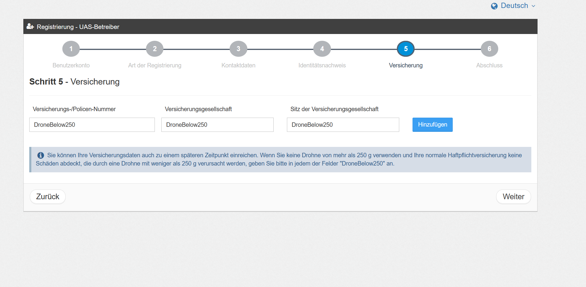 dji mini 사용자의 경우 별도로 가입한 보험이 없다면 모든 필드에 DroneBelow250를 입력하고 Hizufugen을 클릭 후 Weiter를 클릭합니다.