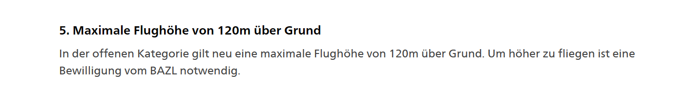마지막으로 최고 고도는 지상으로부터 120m까지만 비행이 허용된다고 써있습니다. 만약 더 높이 비행하고 싶다면 BAZL의 허가가 필요합니다.