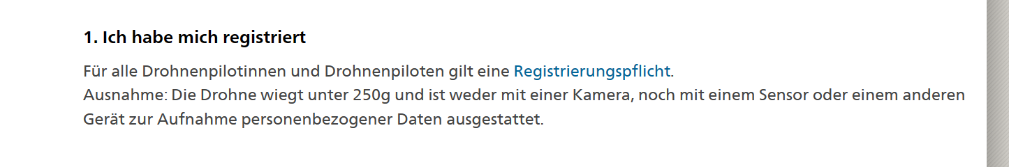Laut Drohnenregulierung gilt für alle Drohnenpilot/innen grundsätzlich eine Registrierungspflicht. Davon ausgeschlossen sind Personen, die Drohnen unter 250g betreiben, welche ohne Kamera, Mikrofon oder sonstigen Sensoren ausgestattet sind, die sich zur