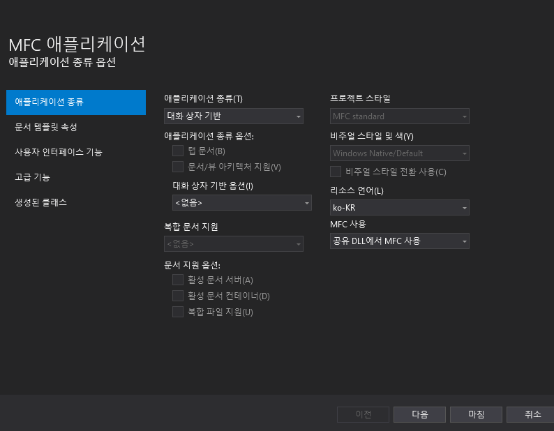 4. MFC 애플리케이션 창이 뜨면 [애플리케이션 종류]를 "대화상자 기반" 으로 변경하고 마침을 클릭합니다. 그러면 대화상자 기반의 프로젝트가 생성됩니다.