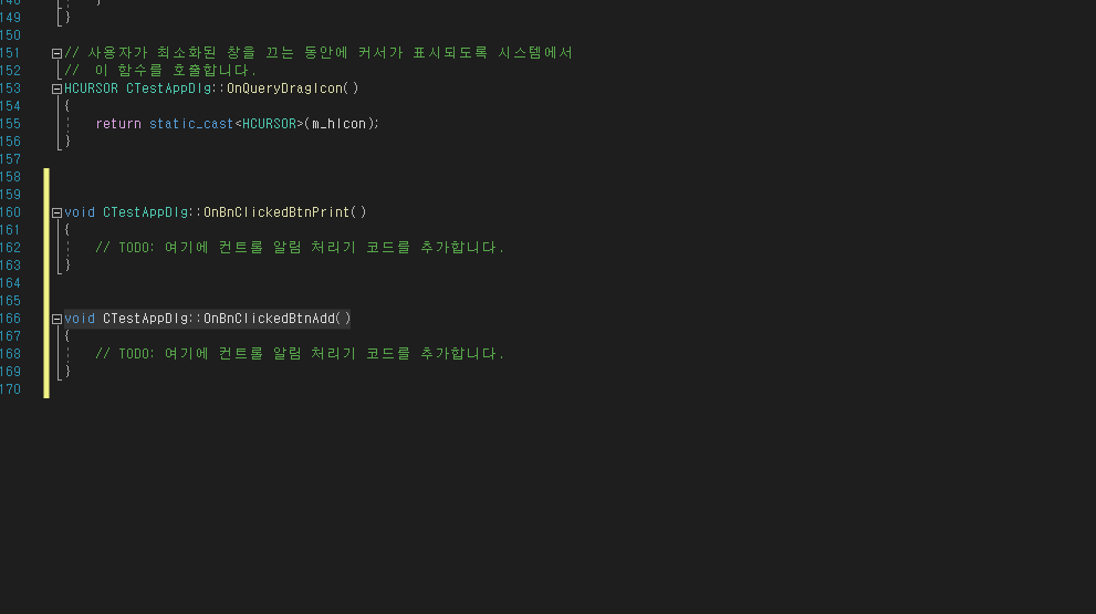 9. 그리고 "문자 출력" 버튼과 "더하기 결과" 를 더블클릭하면 다이얼로그 cpp 파일에는 아래와 같은 메소드가 자동으로 추가됩니다.
