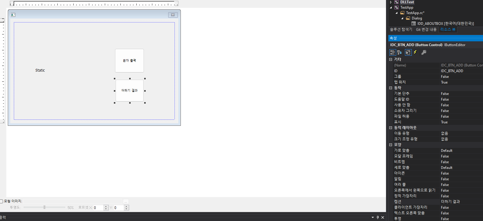 3) 아래쪽 버튼 객체 선택 후 ID를 "IDC_BTN_ADD"로 변경하고 캡션을 "더하기 결과"로 변경.