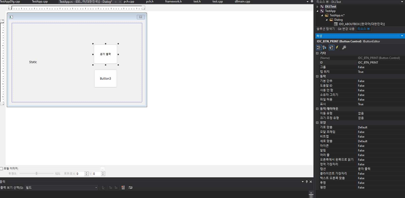 2) 위쪽 버튼 객체 선택 후 ID를 "IDC_BTN_PRINT"로 변경하고 캡션을 "문자 출력"으로 변경