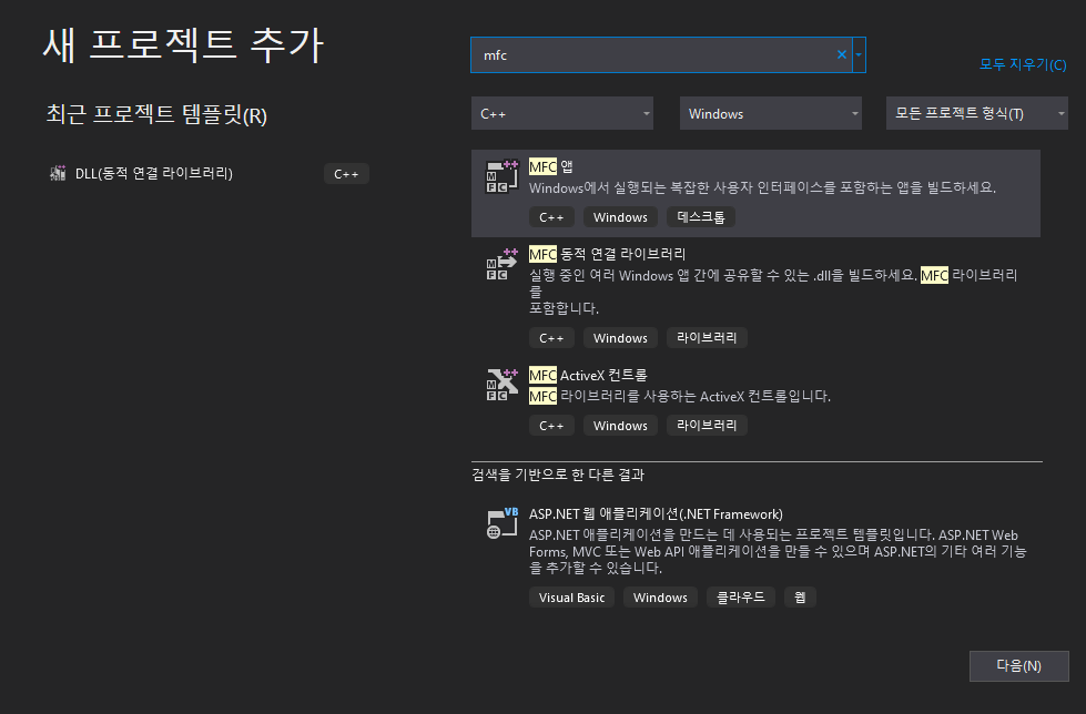 2. 위에서 mfc를 검색하면 MFC 앱이라는 목록이 있습니다. 이것을 선택 후 다음을 누릅니다.