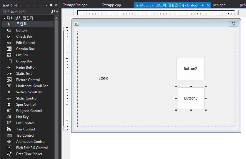 추가방법은 왼쪽에 도구 상자가 있는데, 도구 상자를 클릭하면 [대화 상자 편집기]가 있습니다. 이를 클릭하여 [Button]과 [Static Text]를 선택하여 화면에 그리면 됩니다.