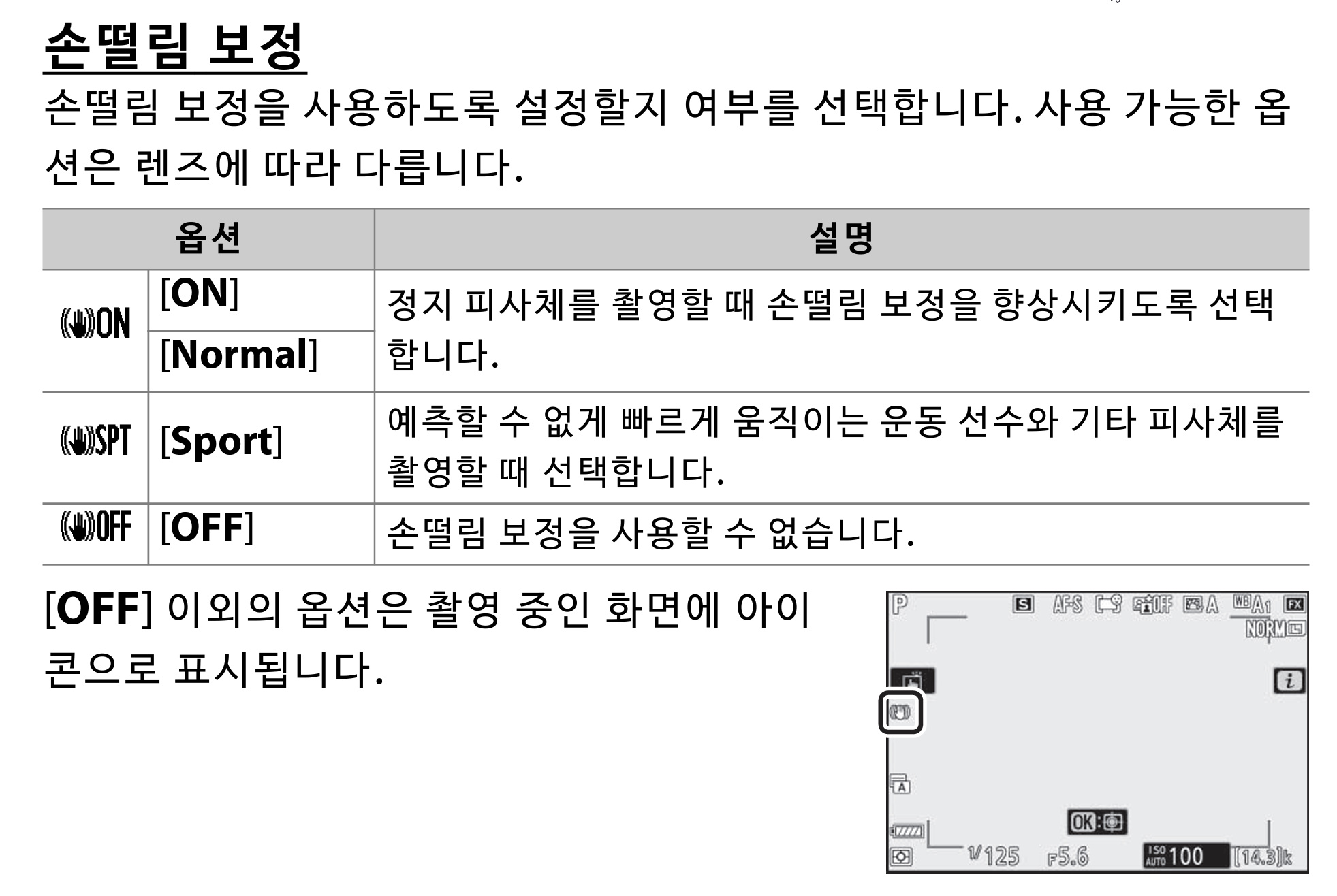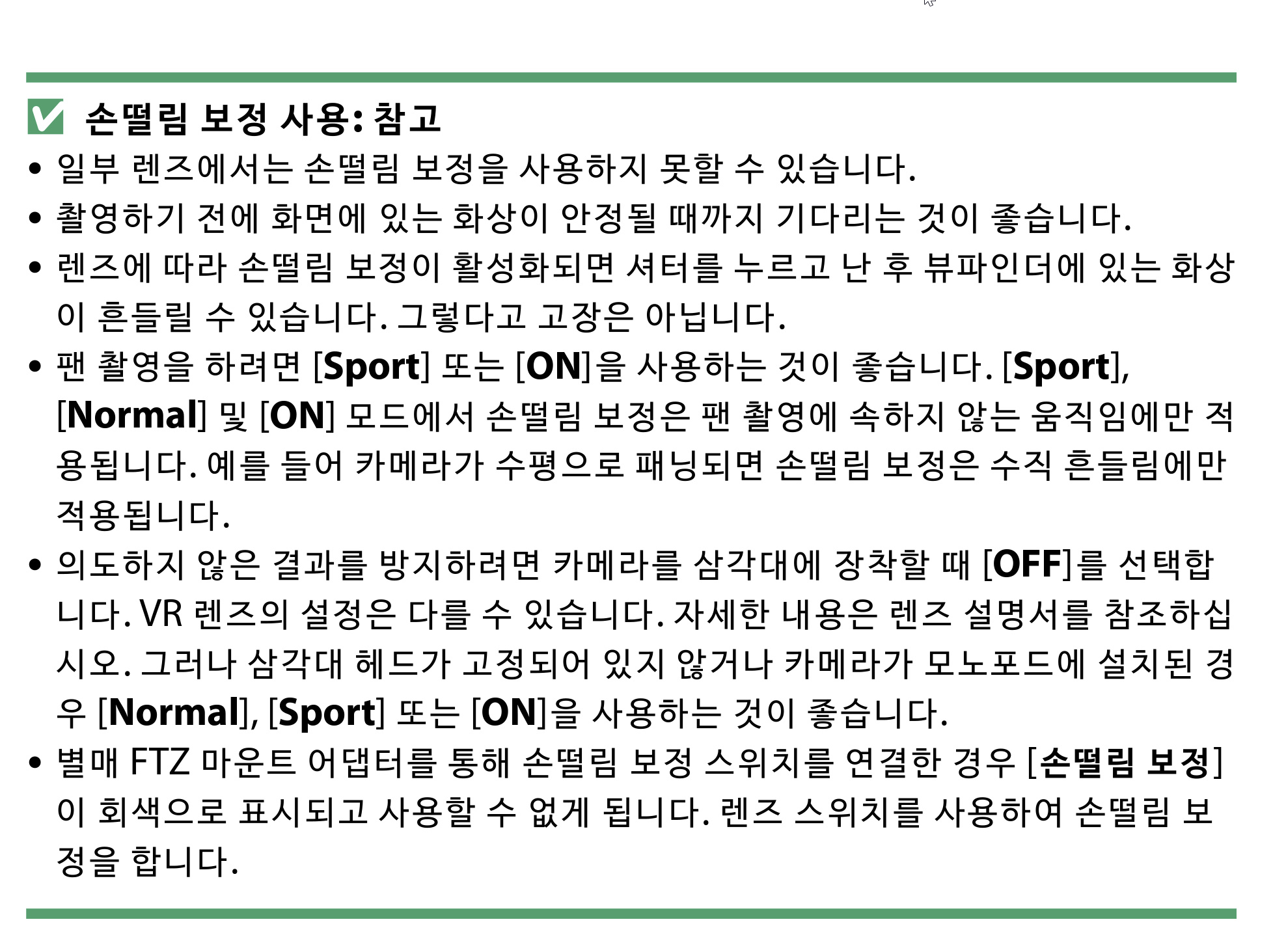 1. 삼각대 마운트시에는 손떨방을 OFF 하는것을 권장한다. 이때 모노포드 삼각대거나, 짐벌 헤드를 사용 할 시에는 손떨방 기능을 사용한다.
