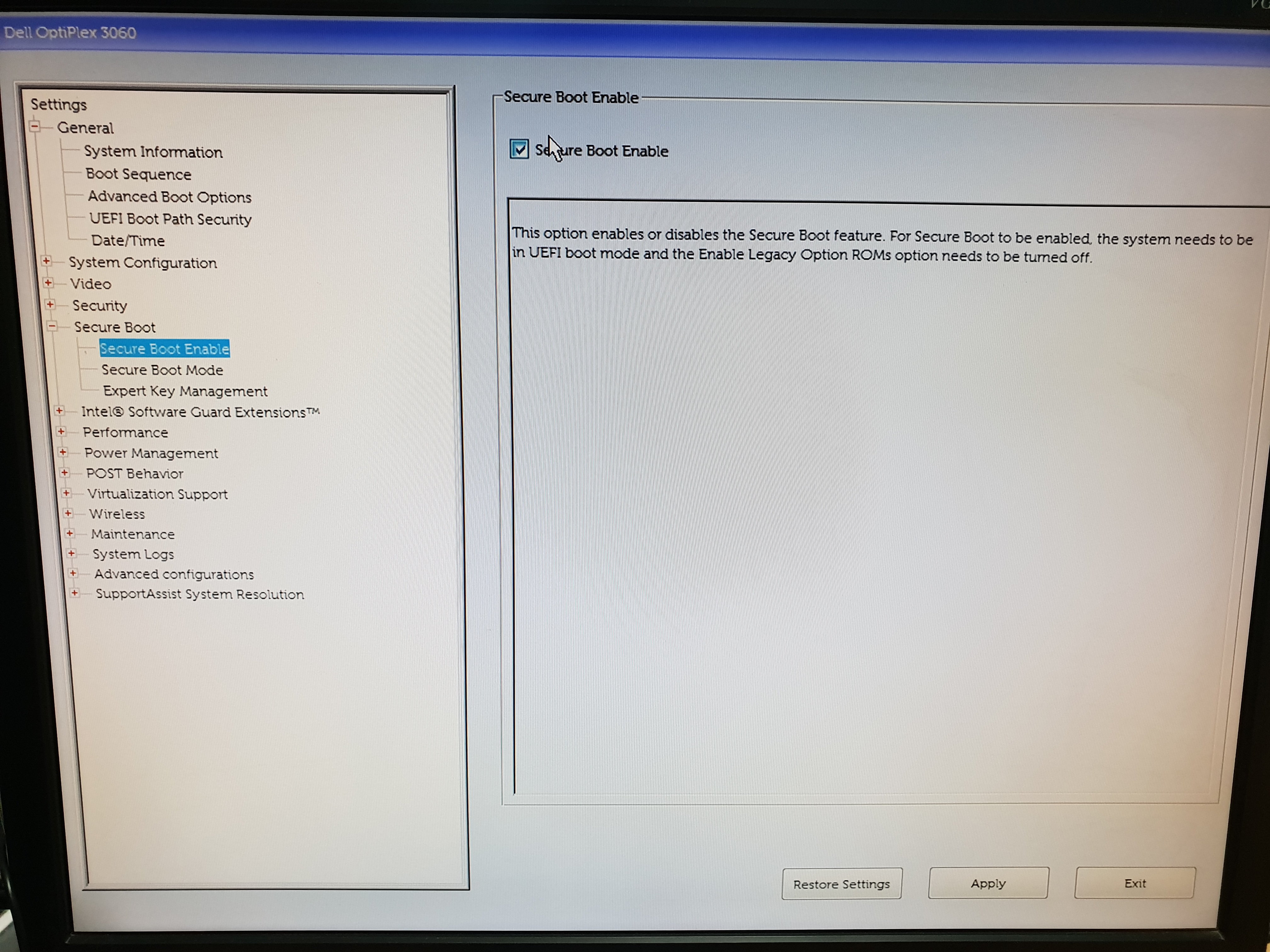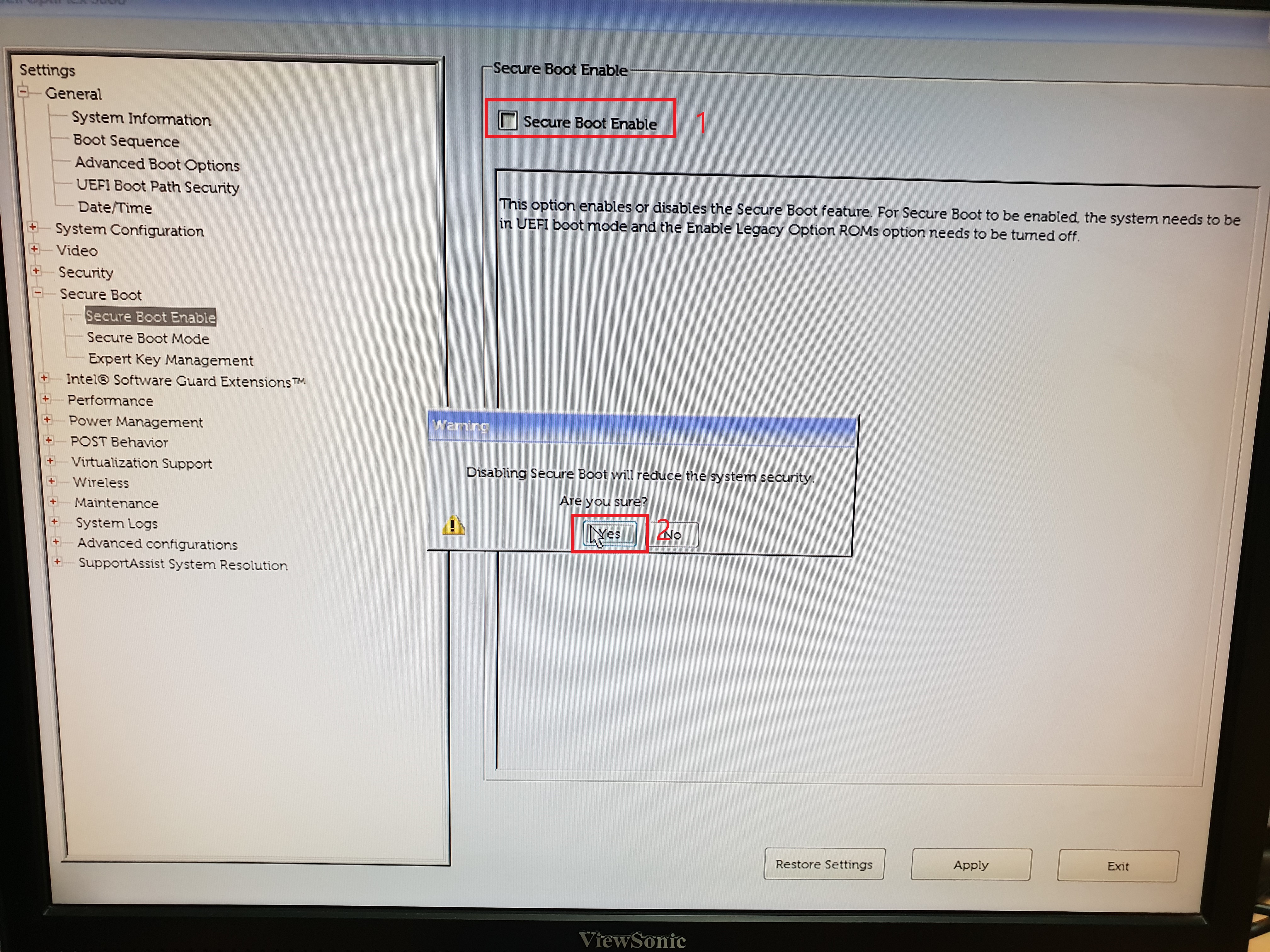 2) Secure Boot Enable 체크박스를 클릭한다. 클릭하면 다시 물어보는데 Yes 클릭한다.
