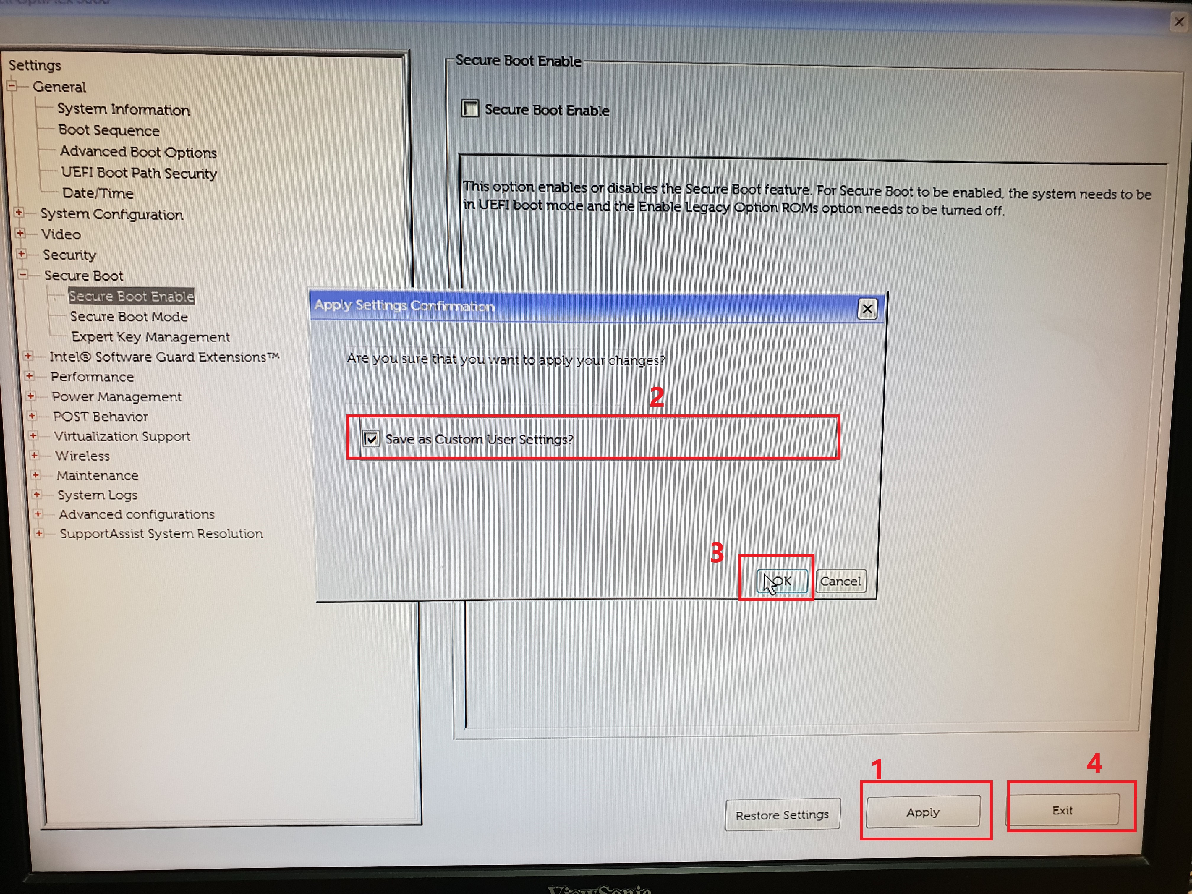 2) Secure Boot Enable 체크박스를 클릭한다. 클릭하면 다시 물어보는데 Yes 클릭한다.
