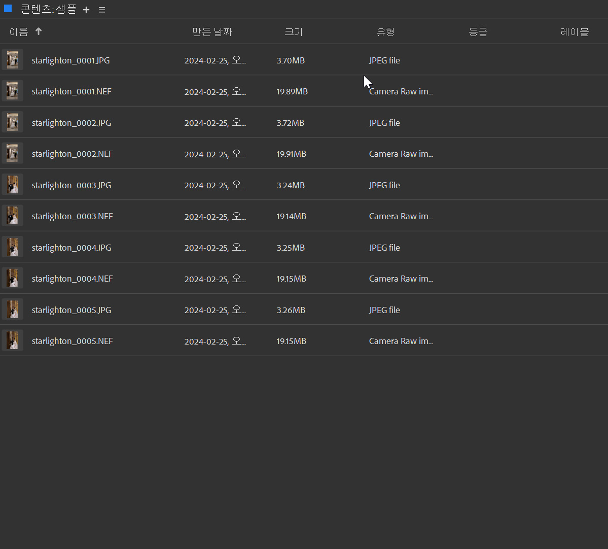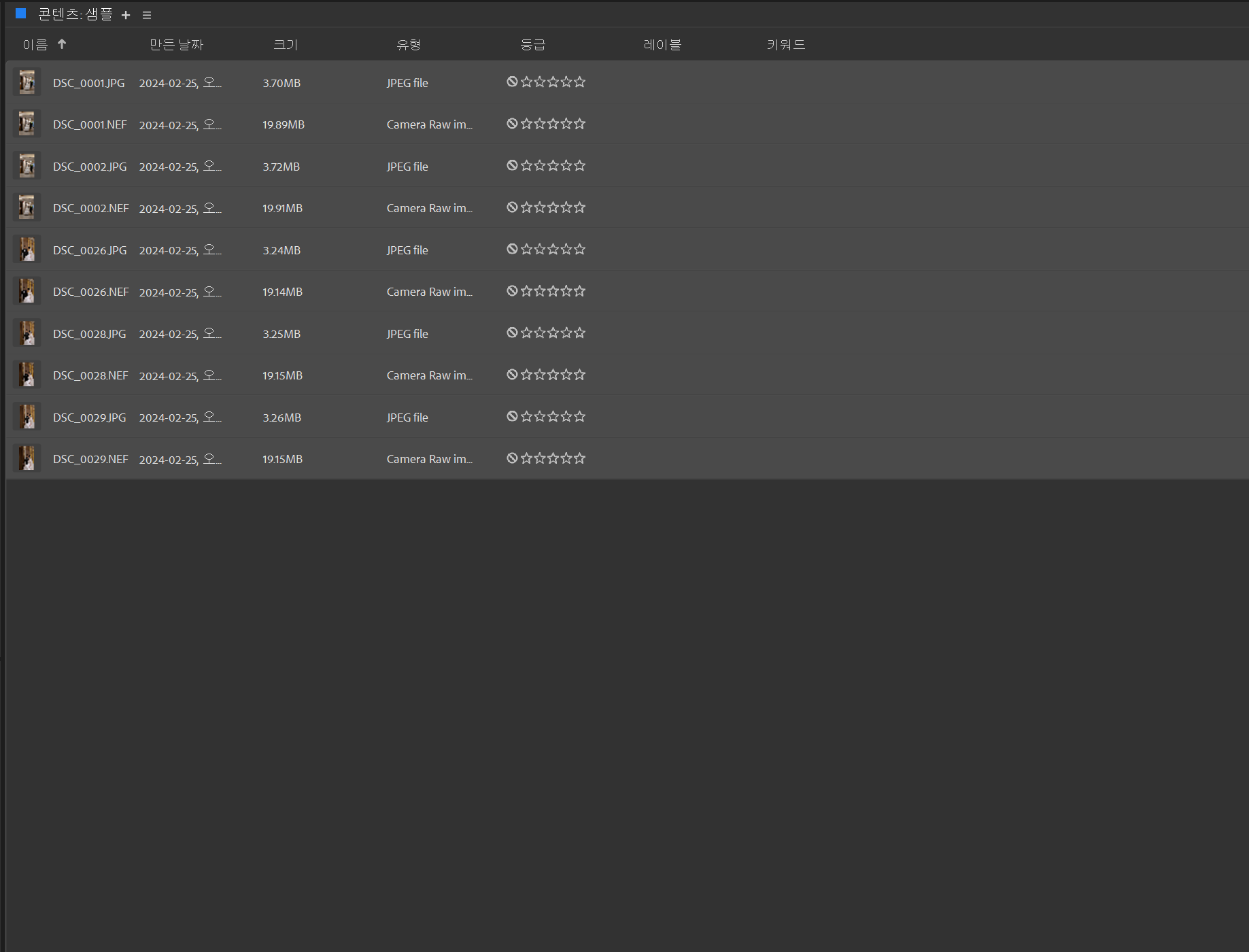 jpg+nef 파일은 시퀀스 번호가 같음이 확인됩니다. 따라서 jpg+nef 컷의 경우 브릿지를 사용하여 변경하길 권장합니다.
