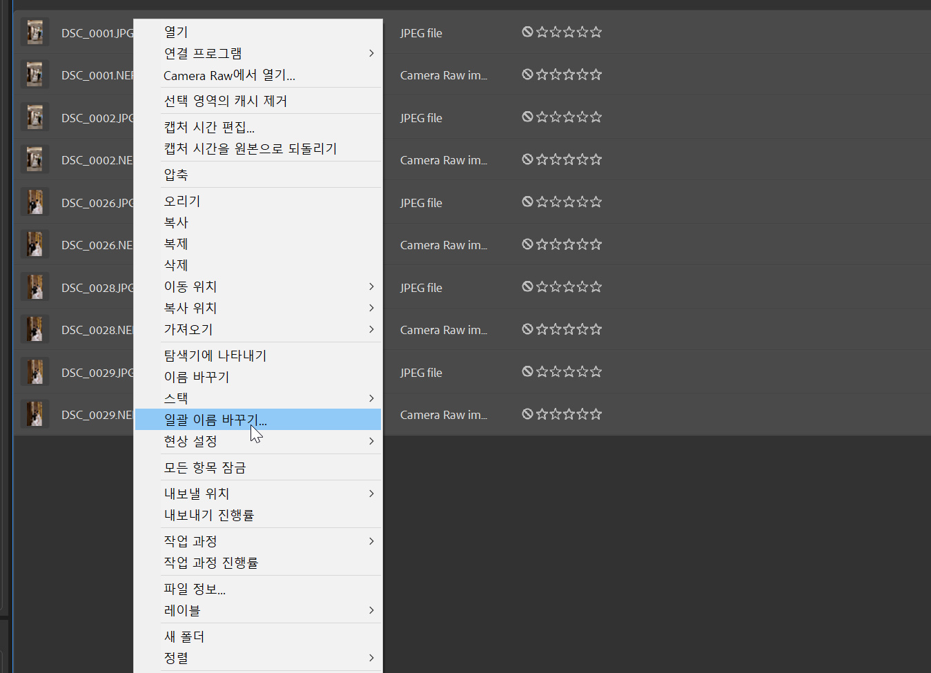 따라서 jpg+raw로 촬영한 컷은 Bridge로 이름을 변경하길 권장하며, jpg 또는 raw만으로 촬영한 컷은 라이트룸 또는 브릿지로 선택하여 처리하시길 바랍니다.