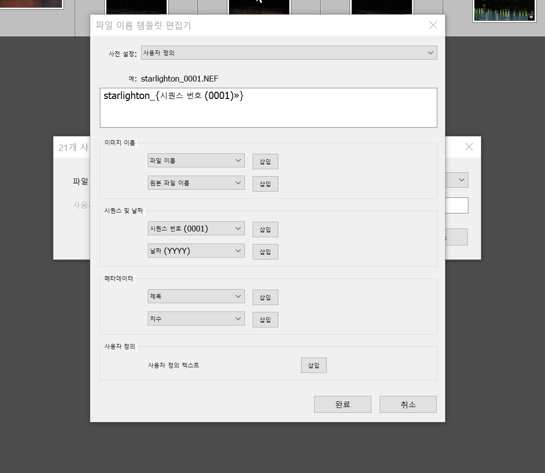 그리고 컷수가 상당히 많거나, DSC_9999보다 DSC_0001이 나중에 촬영된 사진이라면 보기도 불편합니다. 라이트룸에서 촬영 시간으로 정렬하면 문제가 없으나, 탐색기 같은곳에서 파일을 볼때는 파일명으로 정렬되기에 불편하죠. 또한 10000컷이 넘어가면 시퀀스번호를 4자리가 아닌 5자리가 관리하기 편할것입니다.