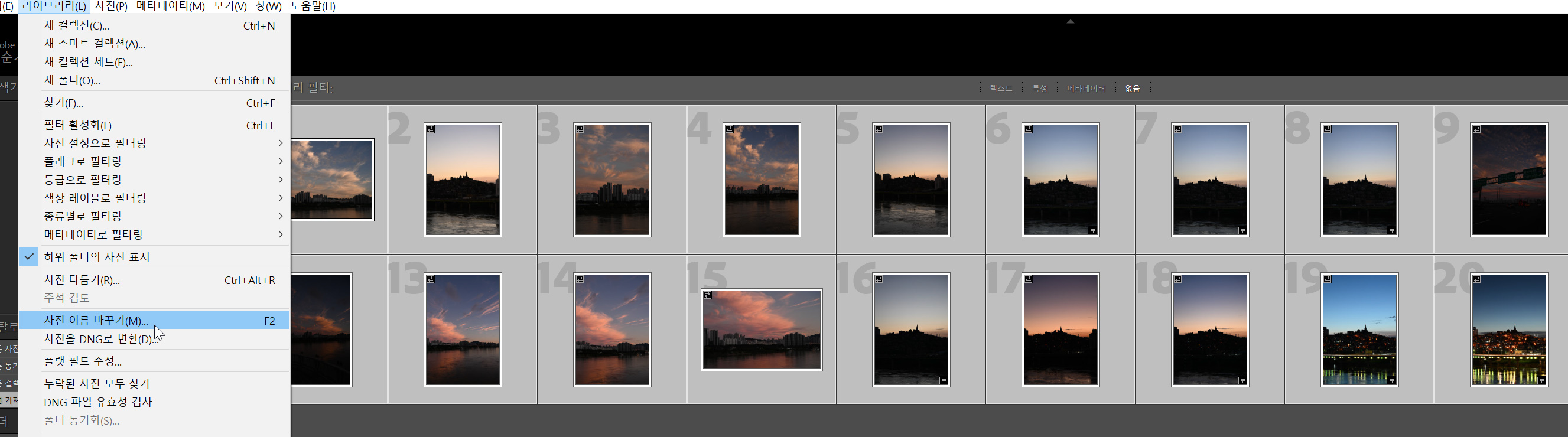 - 이름을 변경할 사진들을 선택하고, [F2] 입력 또는 상단 메뉴에 [라이브러리]에 있는 [사진 이름 바꾸기]를 선택합니다.