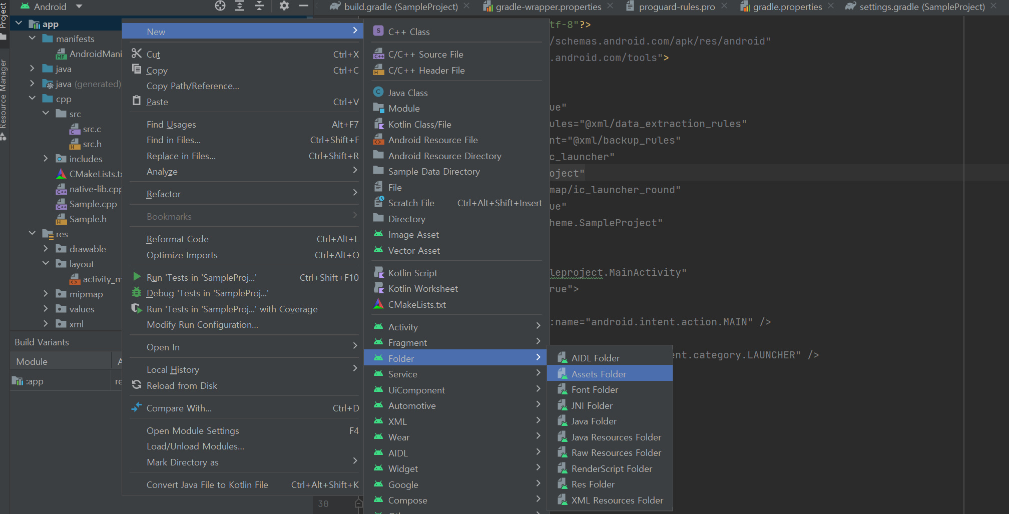1. 프로젝트 창에서 [app] 을 우클릭한뒤 [new] - [Folder] - [Assets Folder]를 클릭합니다.