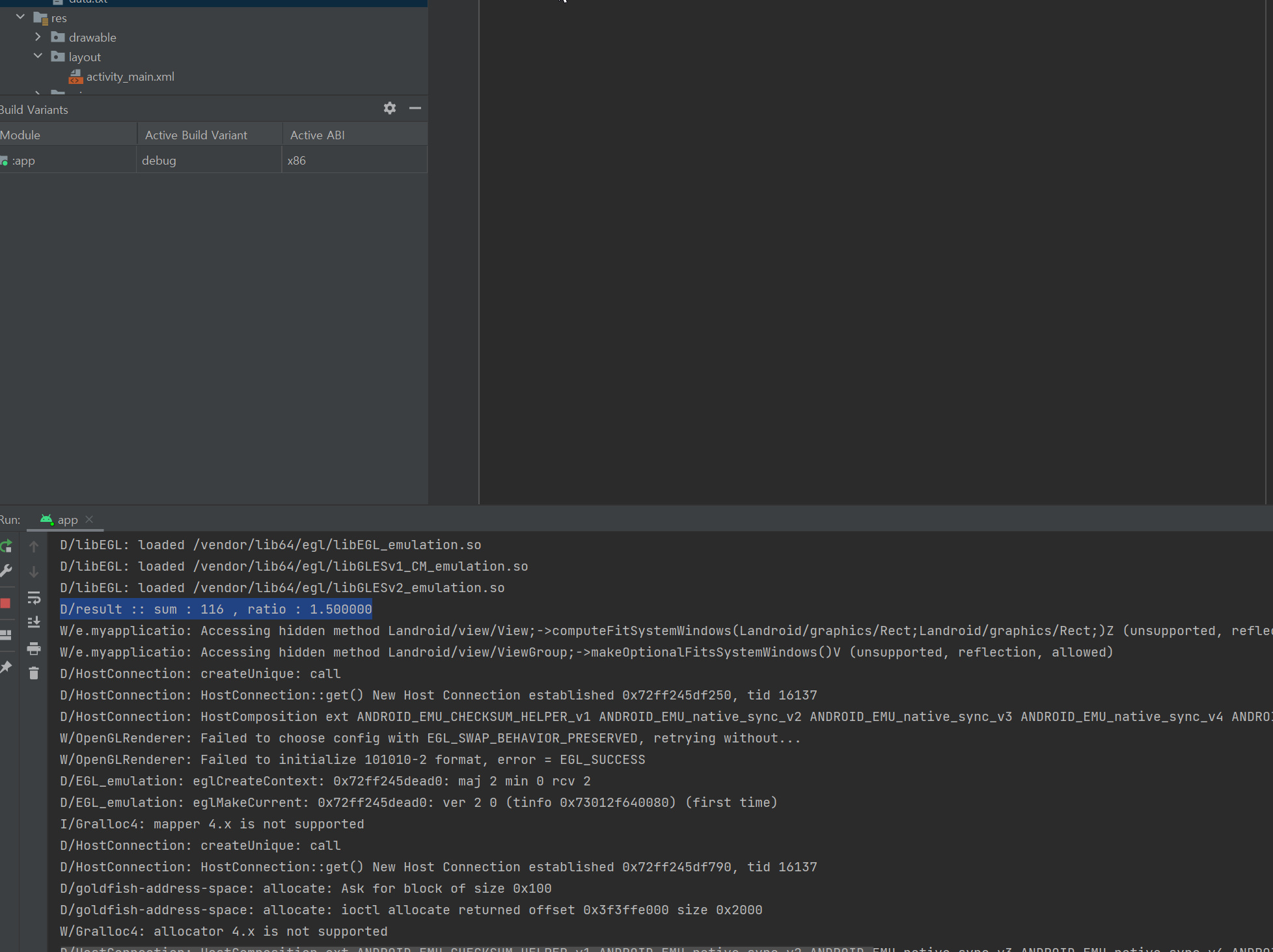 Log.d("result : " , String.format( "sum : %d , ratio : %f", sample.getSampleSumData(n1[0], n2[0]), ratio[0]));