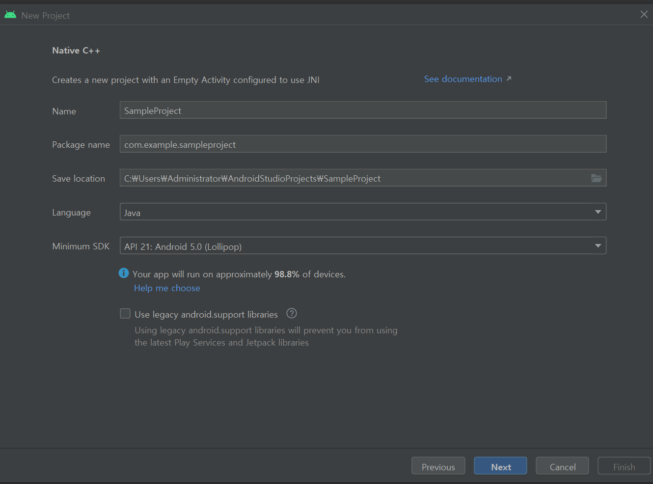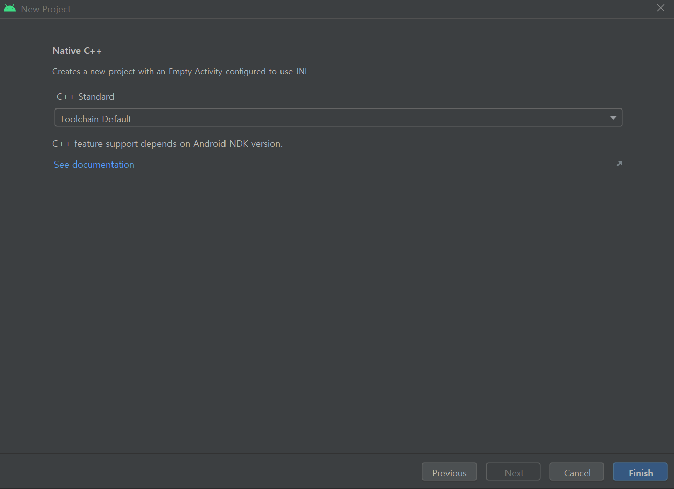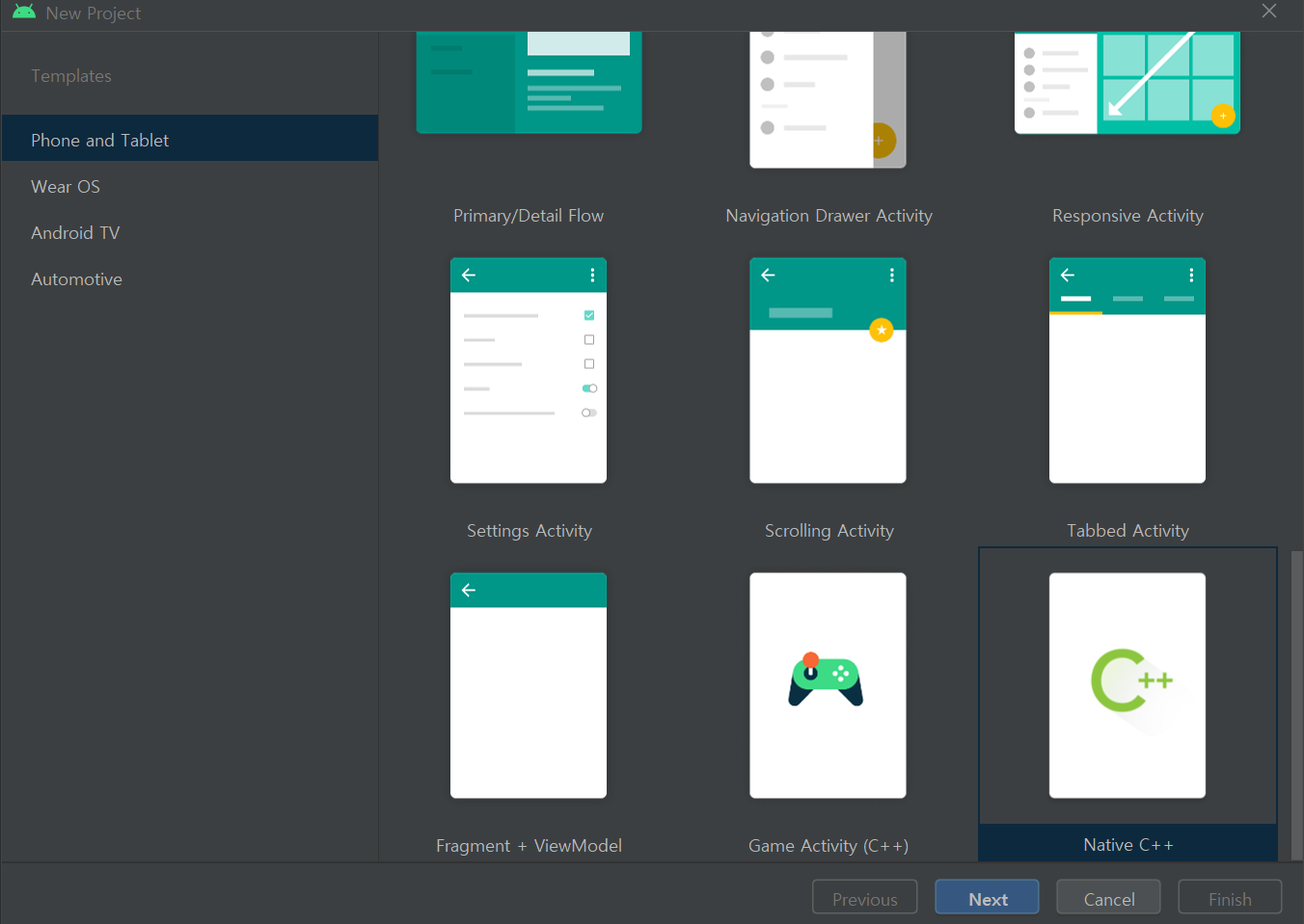 1. Android Studio를 실행한뒤, 프로젝트 생성을 들어가서 Native c++을 선택합니다.