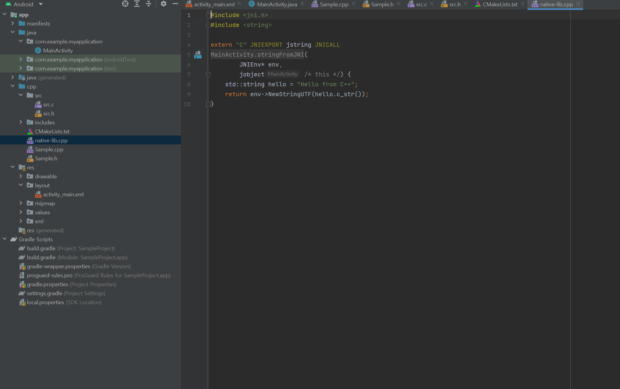 1. 프로젝트 폴더에서 app/src/main/cpp/ 에 자신이 라이브러리로 만들고자 하는 소스파일을 넣습니다.