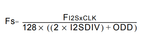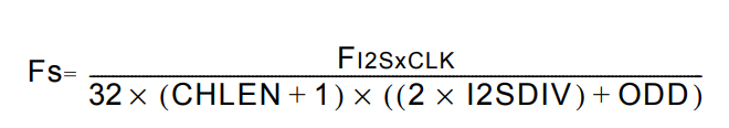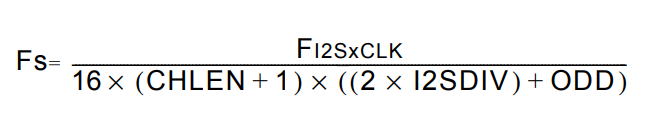 샘플링 주파수(Fs)는 일반적으로 192kHz, 96kHz, 48kHz, 44.1kHz, 32kHz, 22.05kHz, 16kHz, 11.025kHz, 8kHz(또는 이 범위 내의 다른 값들)을 사용합니다. 원하는 Fs에 맞추기 위해 분주기 설정이 필요하며, 아래 공식에 따라 설정합니다.