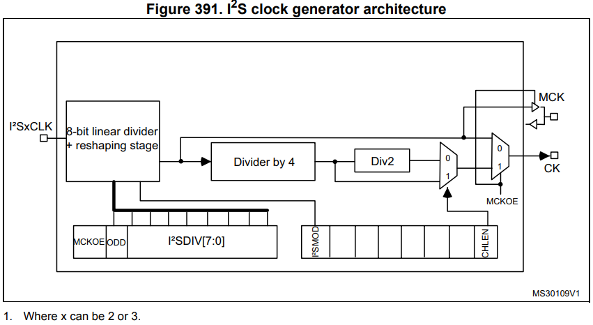 아래는 I2S Clock 생성에 대한 아키텍처를 보여줍니다.
