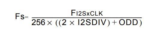 샘플링 주파수(Fs)는 일반적으로 192kHz, 96kHz, 48kHz, 44.1kHz, 32kHz, 22.05kHz, 16kHz, 11.025kHz, 8kHz(또는 이 범위 내의 다른 값들)을 사용합니다. 원하는 Fs에 맞추기 위해 분주기 설정이 필요하며, 아래 공식에 따라 설정합니다.