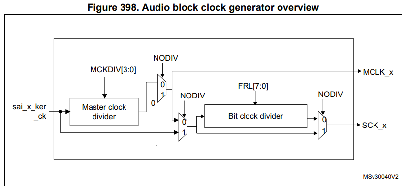 오디오 블록이 마스터(Master)로 선언되고 SAI_xCR1 레지스터의 NODIV 비트가 0으로 설정된 경우에는, 외부 디코더를 위한 마스터 클럭(MCLK)을 I/O 핀(MCLK_x)을 통해 외부로 출력할 수 있습니다.