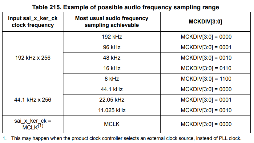 - MCKDIV[3:0] ≠ 0000인 경우(나눠져서 출력): MCLK_x = sai_x_ker_ck / (MCKDIV × 2)