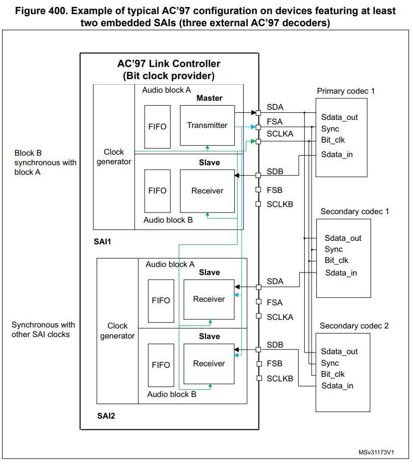 - B는 내부적으로 블록 A와 동기화된 상태로 구성 - SAI2: 외부 SAI1에 동기화된 슬레이브 수신기 (A, B 모두) SAI1과 동기화된 상태의 슬레이브 수신기(slave receiver)로 구성