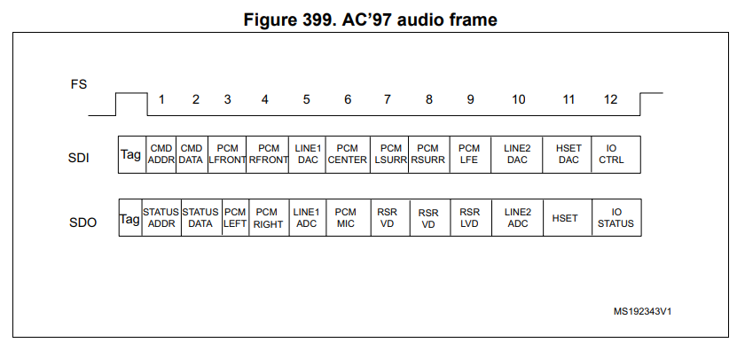 SAI는 AC’97 프로토콜을 지원하여 슬롯 수/크기가 고정된 고정형 오디오 프레임 구조를 구현할 수 있습니다.