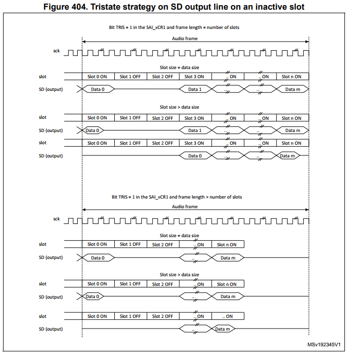 만약 SAI_xCR2 레지스터의 TRIS 비트가 클리어(=0)되어 있다면, 위 그림 Figure 404 및 405에서 SD 출력 라인이 high-Z가 되던 모든 부분은 0을 출력하도록 대체됩니다.