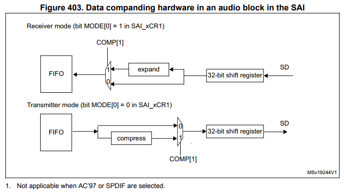 Compression(압축) 모드가 적용됩니다. - SAI 오디오 블록이 수신기(receiver)로 선언되어 있다면, Expansion(확장) 알고리즘이 적용됩니다.