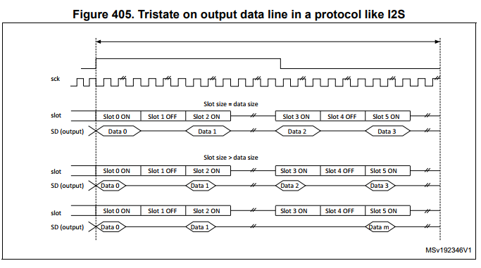 송신 간 간격을 확보하기 위해, 데이터 길이가 32비트보다 짧은 경우, SAI_xSLOTR 레지스터의 SLOTSZ[1:0] = 10으로 설정하여 데이터를 32비트로 확장할 수 있습니다. 이렇게 설정하면, 활성 슬롯(active slot)의 LSB 이후(0으로 패딩되는 동안), 다음 슬롯이 비활성인 경우 SD 라인이 tri-state(high-Z)로 전환됩니다.