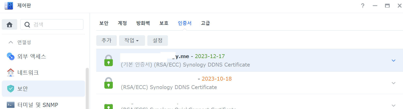 7. [제어판] - [보안] - [인증서]에 본인이 등록한 도메인의 인증서가 있는지 확인합니다.