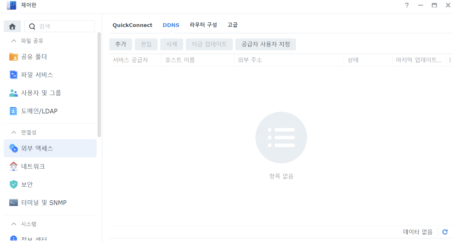 2. [제어판] - [외부 엑세스] - [DDNS]를 클릭하고 [추가] 버튼을 누릅니다.