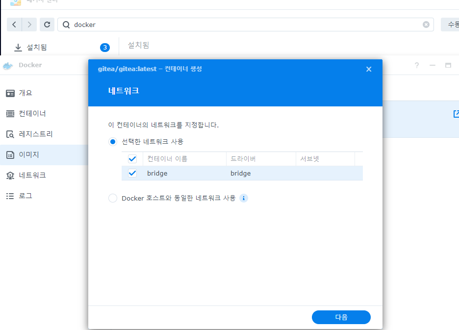 6. 실행을 하면 아래와 같은 컨테이너 생성창이 뜹니다. 다음을 눌러 넘어갑니다.