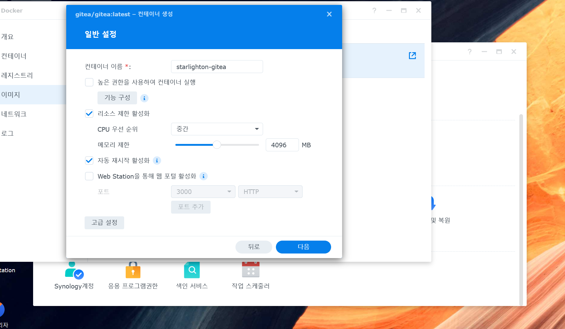 저같은 경우는 리소스를 과다하게 사용하는것을 막기 위해 "리소스 제한 활성화"를 체크하였으며, 자동 재시작도 활성화 하였습니다.