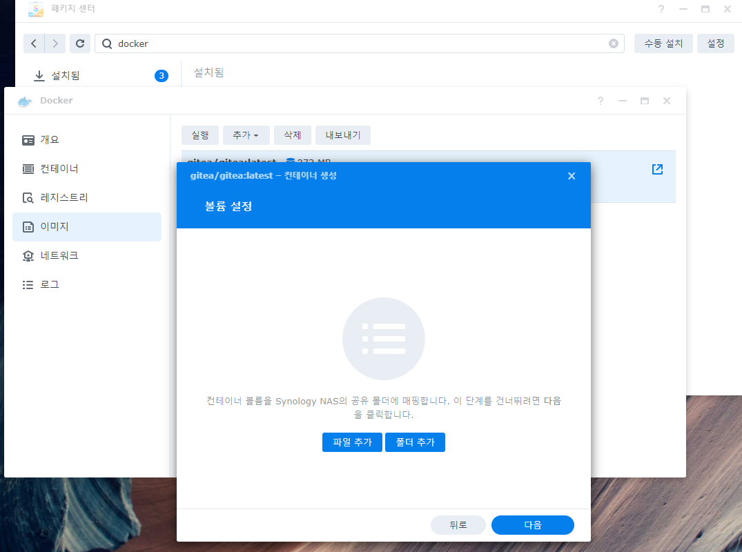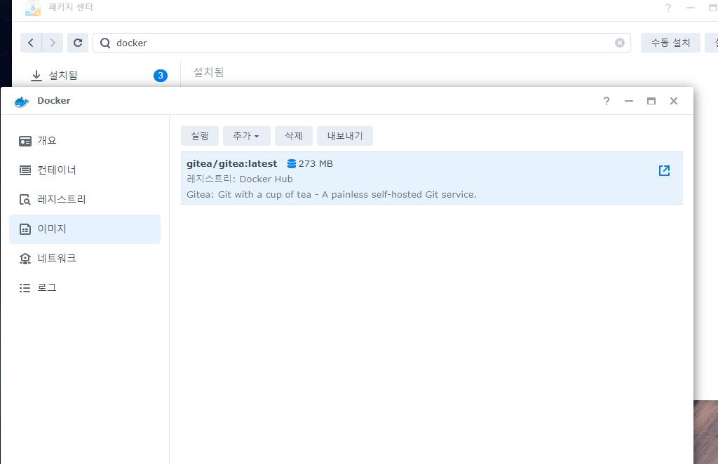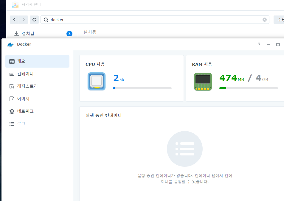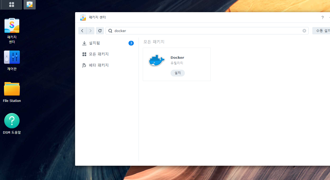 1. NAS의 DMS로 접속합니다. 그리고 패키지 센터에서 Docker를 검색하여 설치합니다.