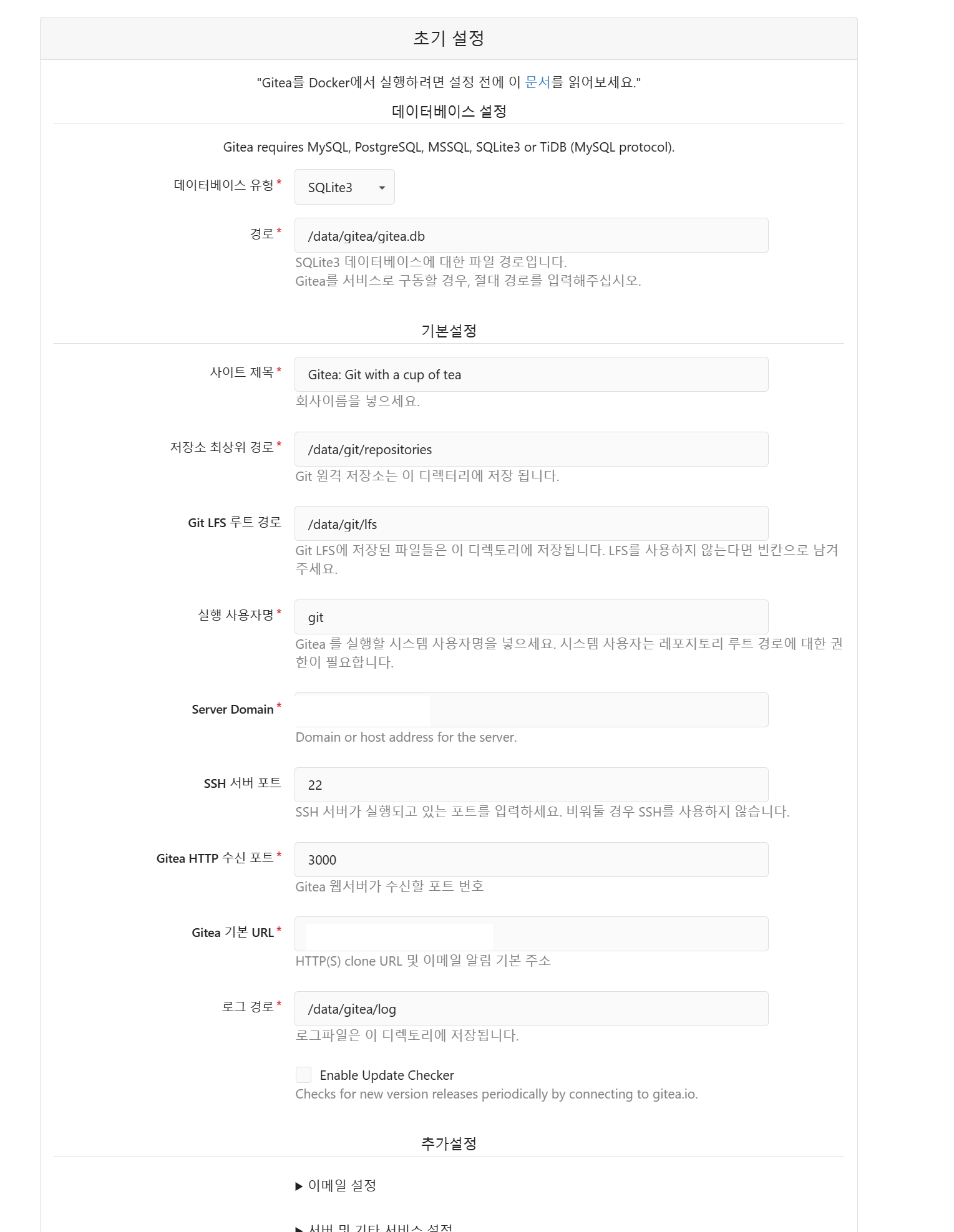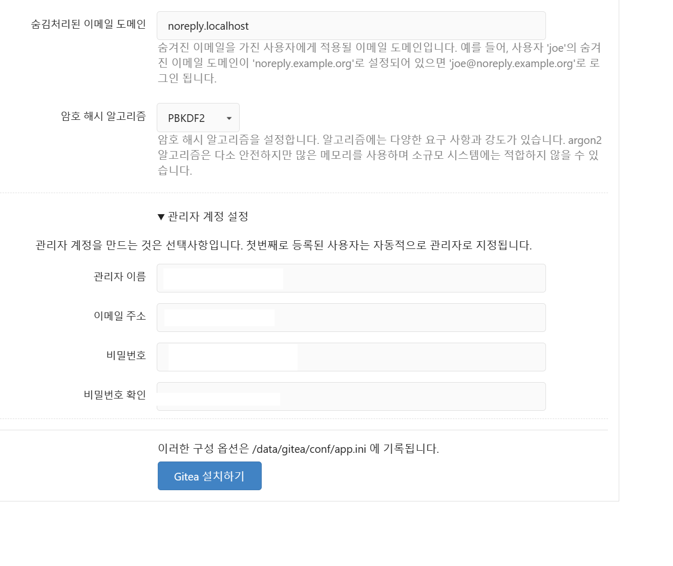 그리고 하단에 [gitea 설치하기] 버튼을 클릭합니다.