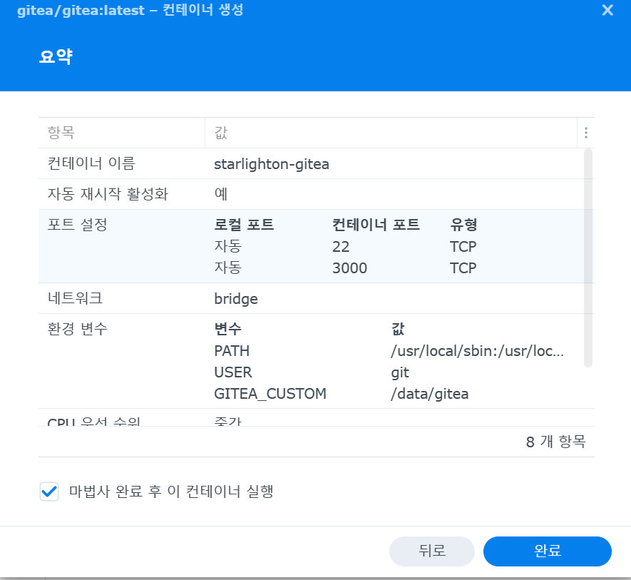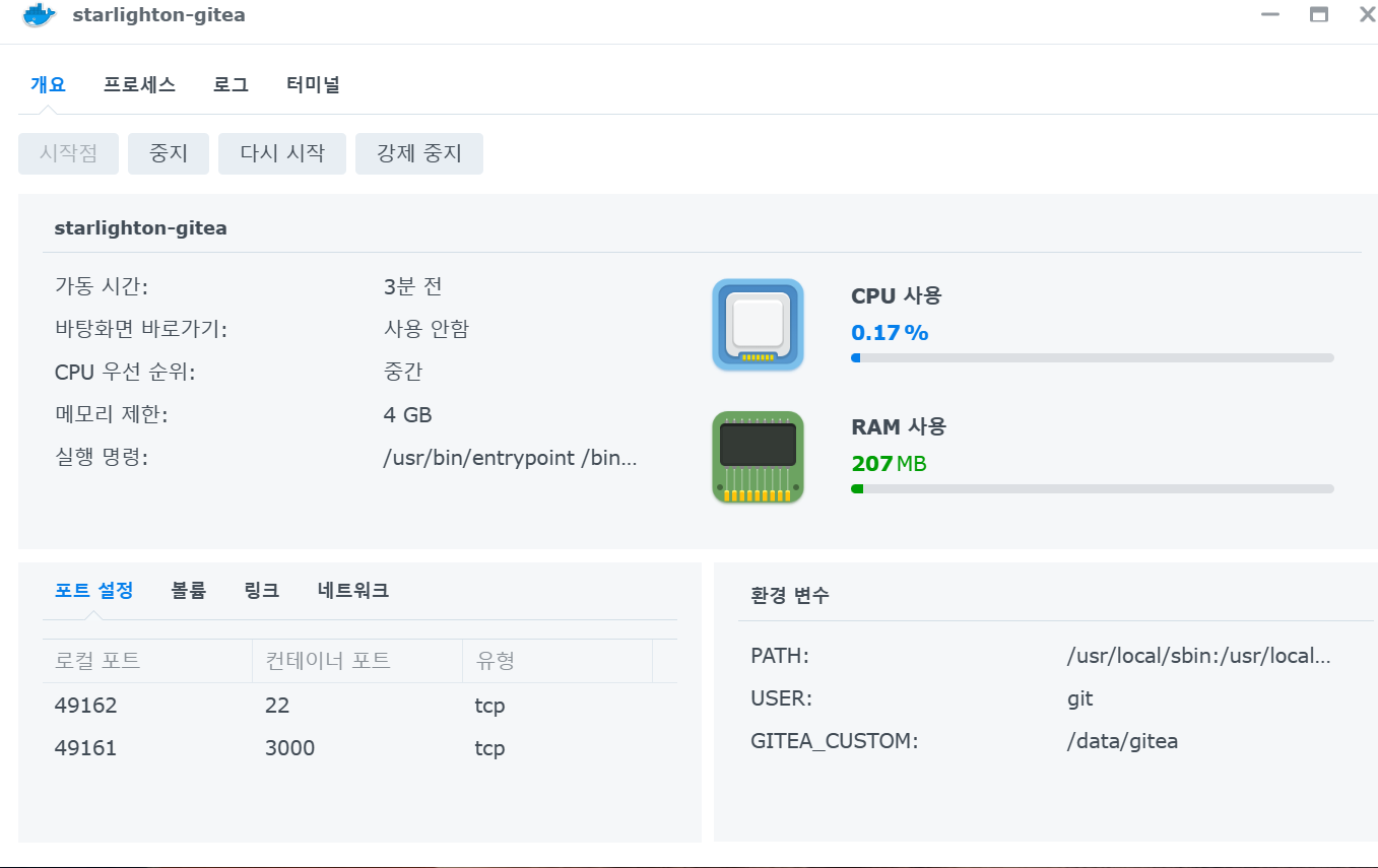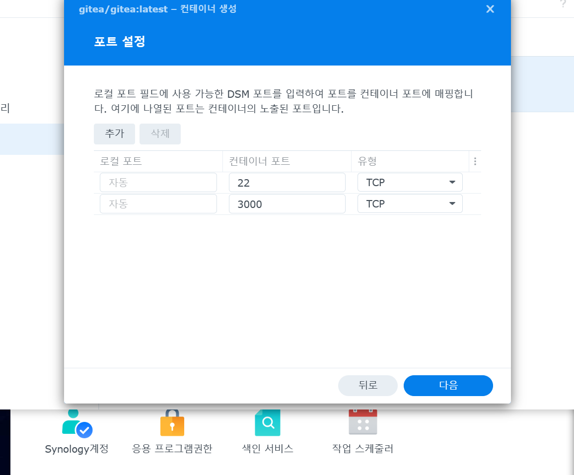 컨테이너 포트의 기본은 22, 3000 입니다. 로컬포트는 자동으로 되어 있어서 gitea이 재시작을 하게되면 포트번호는 변하게 됩니다. 만약 변하는것을 원하지 않거나 외부에서 접근이 가능하도록 하고 싶다면, 로컬 포트에 고정값을 입력합니다.
