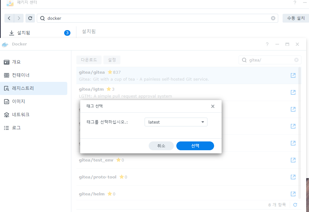 4. gitea/gitea를 더블클릭하면 다운로드 창이 뜨는데 최신버전인 latest를 선택합니다. 그러면 다운로드를 진행하게 됩니다.