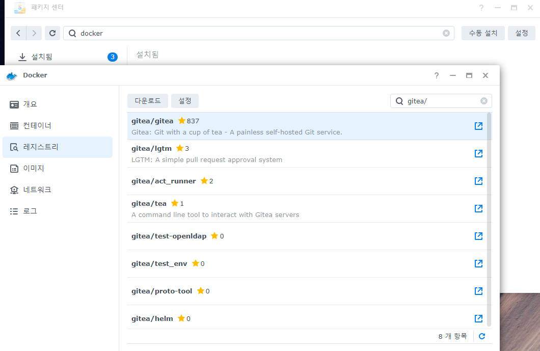 3. 왼쪽 탭에서 레지스트리를 선택하고, 키워드 검색창에 gitea/ 를 검색합니다.