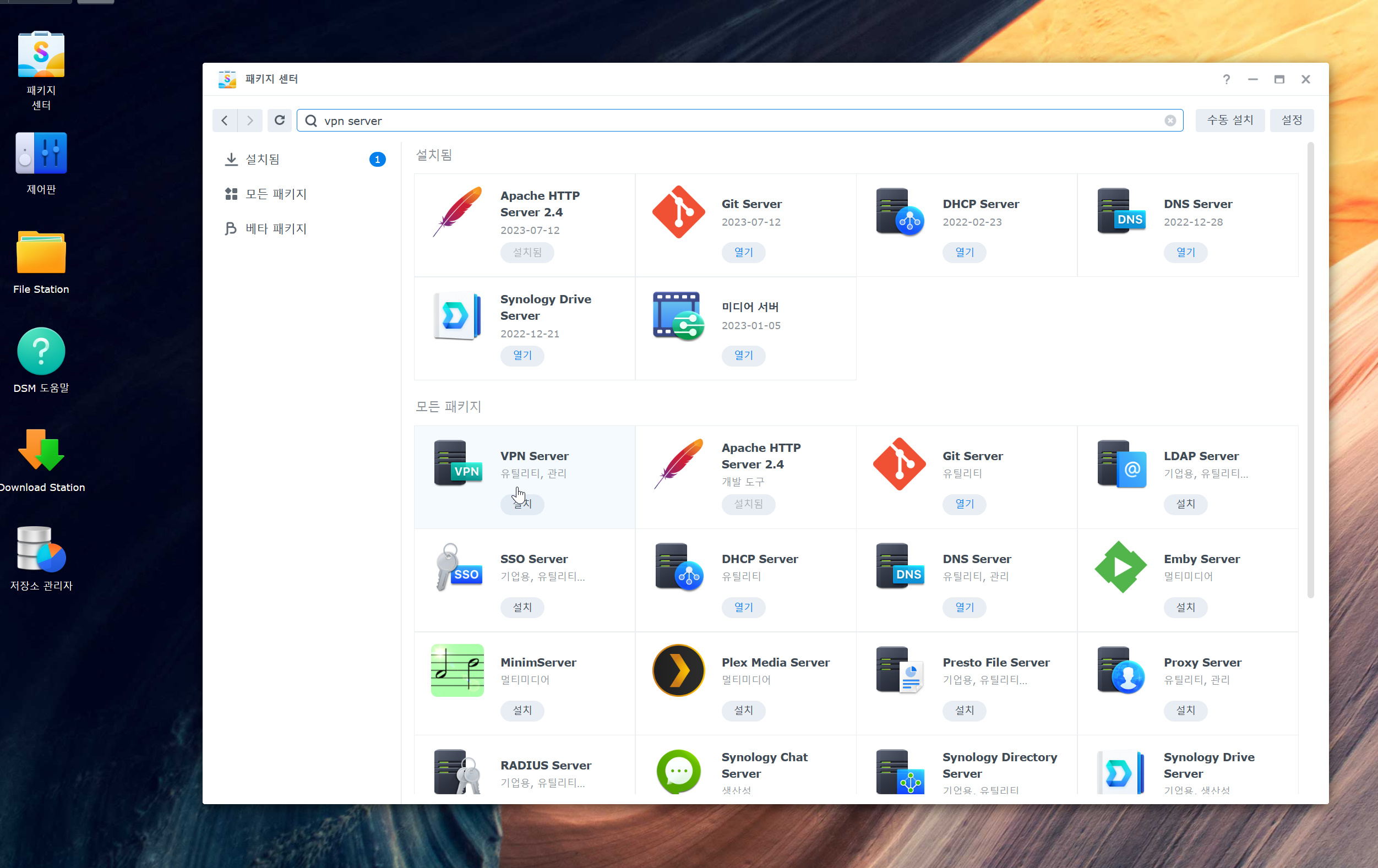 2. [패키지 센터] 를 클릭하여 vpn server를 검색합니다.