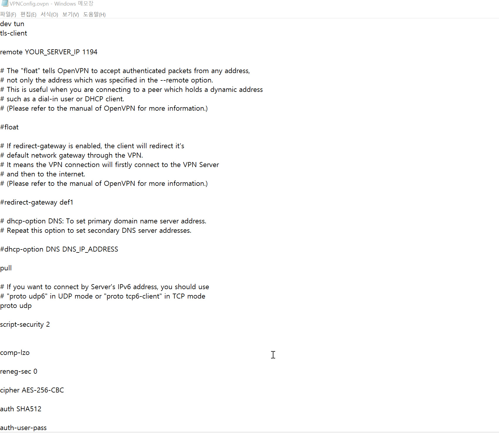 10. 4번째 줄에 remote YOUR_SERVER_IP 1194라고 되어있는것을 확인 할 수 있습니다.
