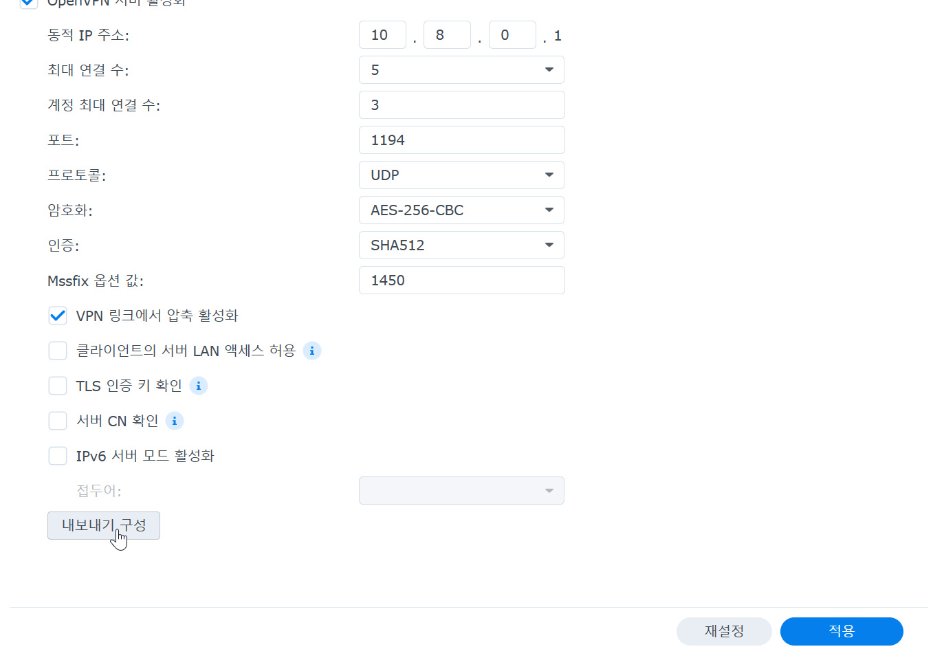 7. 아래의 [내보내기 구성]을 클릭합니다. 클릭하면 openvpn.zip이라는게 다운로드 됩니다.