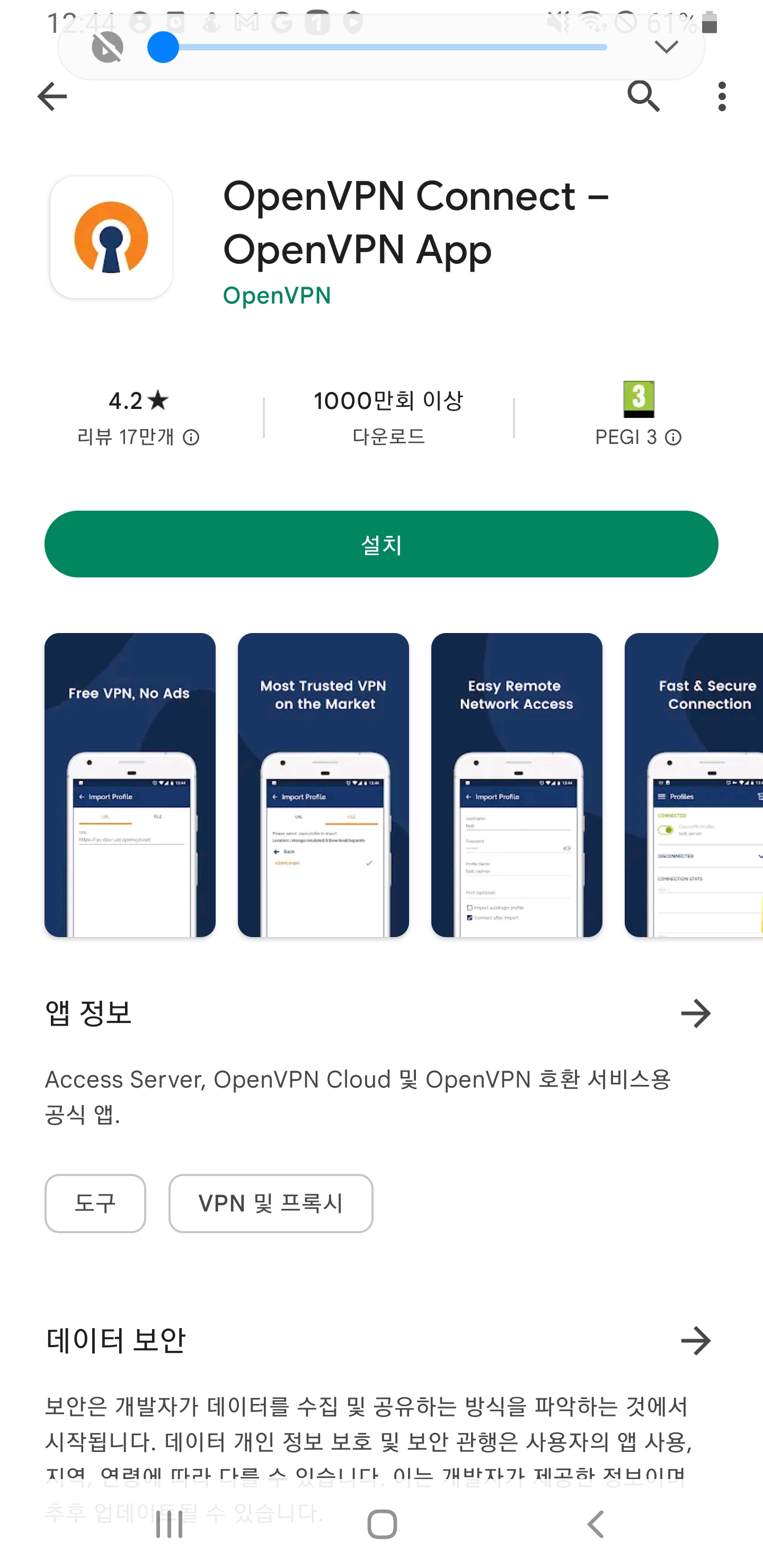 2) google play store 앱에서 openvpn을 검색하고 OpenVPN Connect를 설치합니다.
