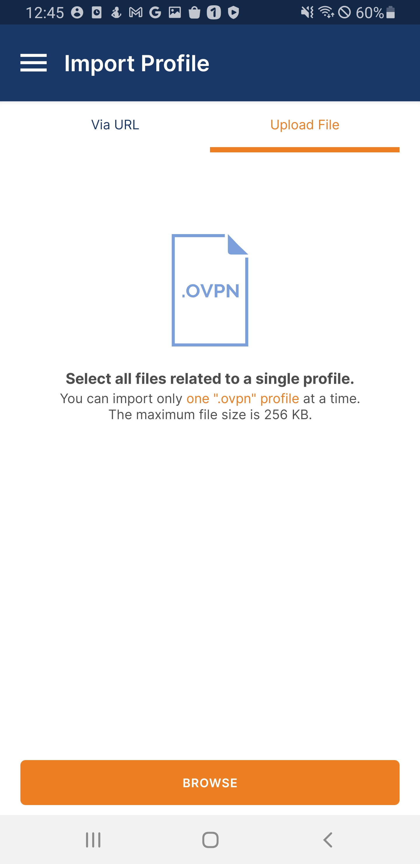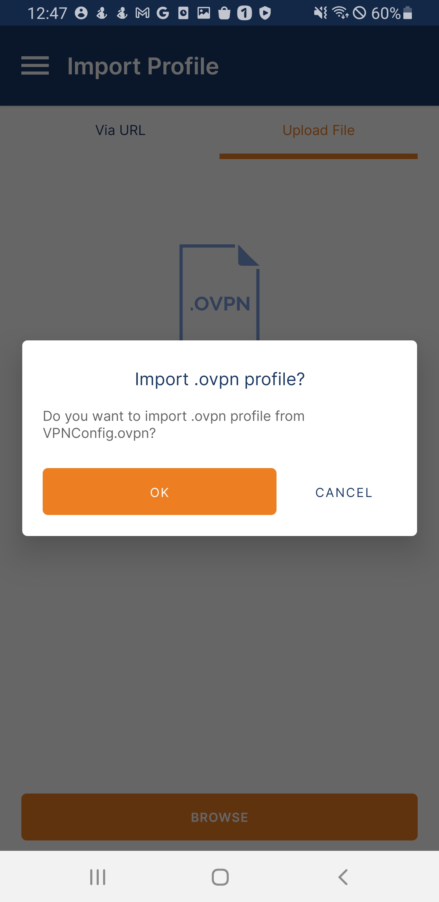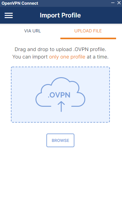 3) 설치가 끝났으면 OpenVPN Connect를 실행하고 UPLOAD FILE을 클릭합니다. 그리고 Browse를 클릭하여 앞서 진행한 설정에서 만들어낸 ovpn 파일을 선택합니다.